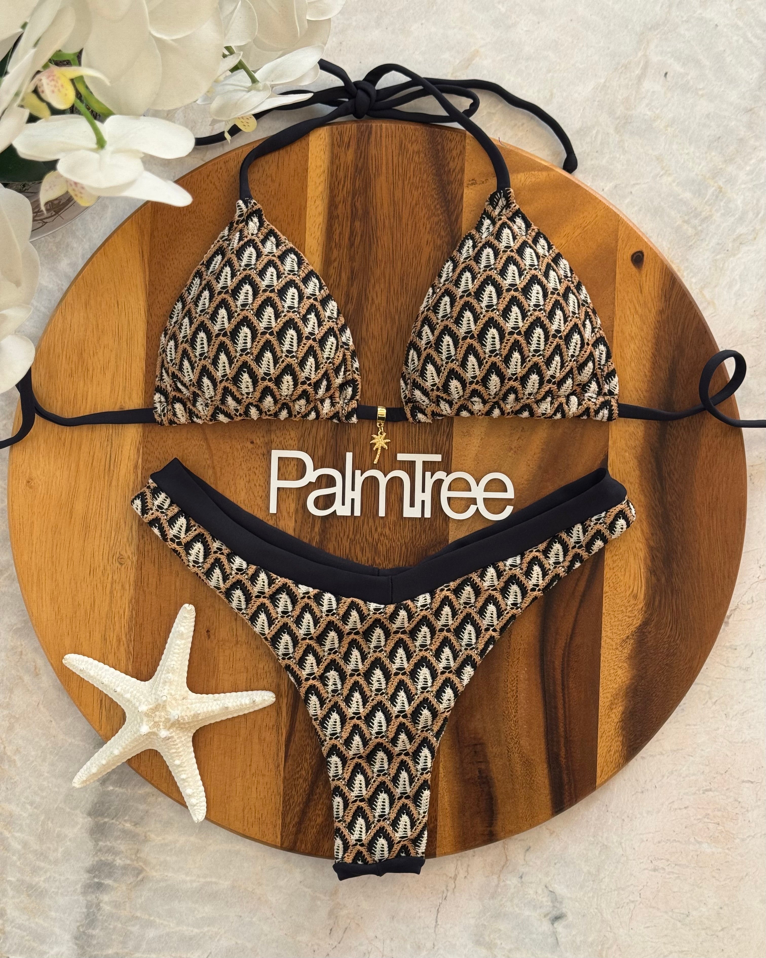 A classic padded triangle top with a delicate center PalmTree charm adds a bold touch of luxury, paired with a high-cut Brazilian bottom for a flattering, cheeky fit. Featuring our standout Shell Lace finish, this refined yet daring set embodies timeless beauty and sun-ready confidence.