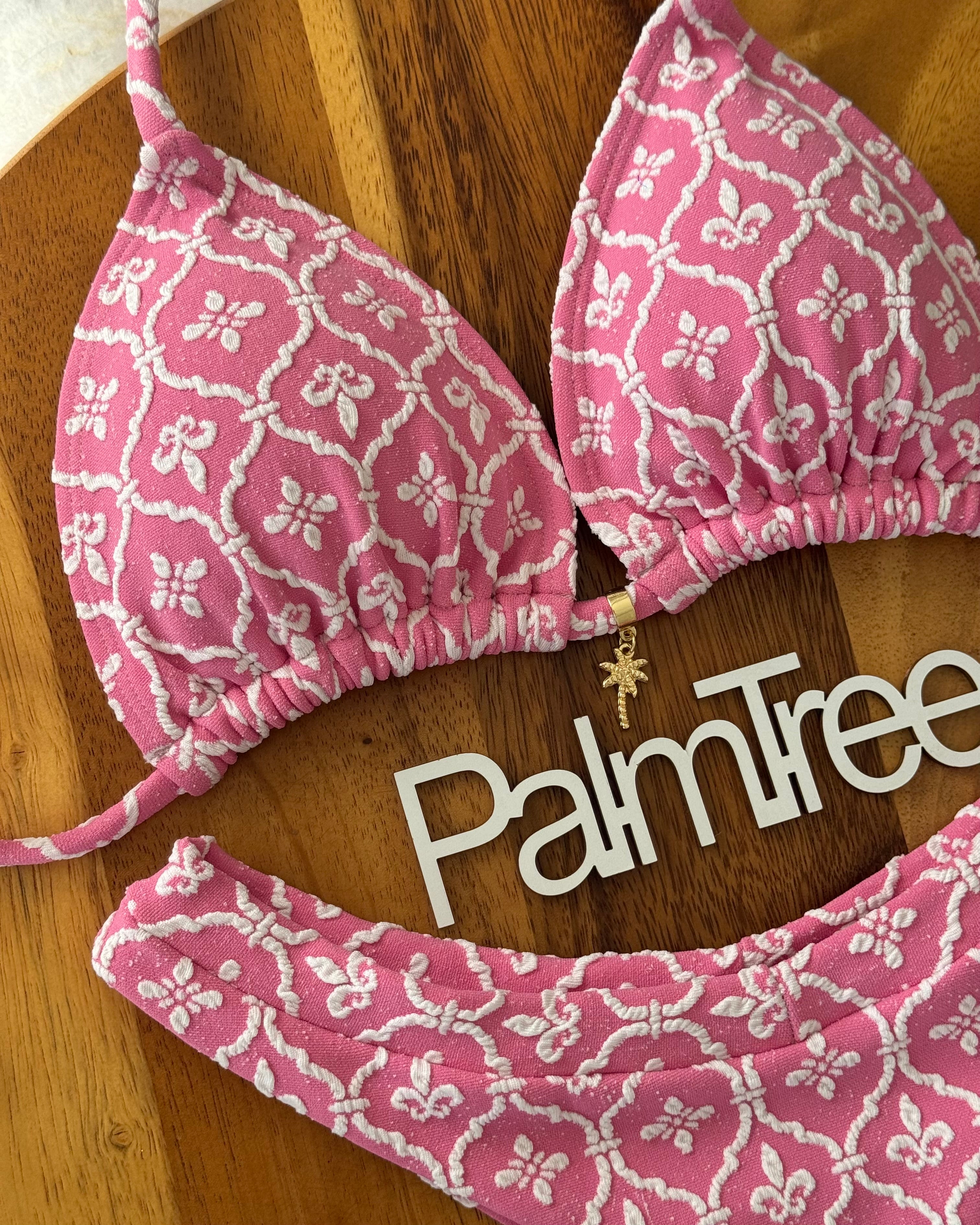 This jacquard bikini features a padded triangle top with adjustable neck and back ties, offering a flattering and customizable fit. The rich jacquard texture adds depth and sophistication, elevating the classic triangle silhouette. Paired with a high-cut Brazilian bottom, the design enhances the curves with a cheeky, sculpting finish. A delicate gold tag detail completes the look, delivering a timeless yet bold statement for confident, sun-ready style